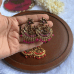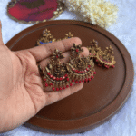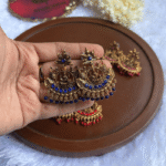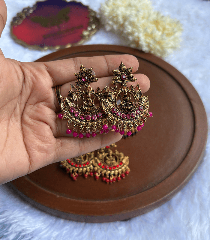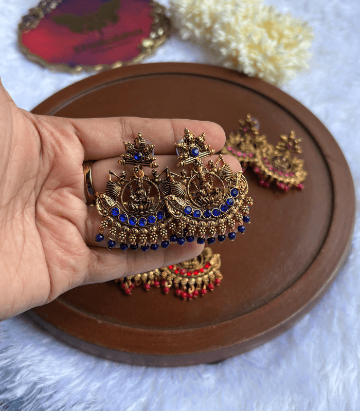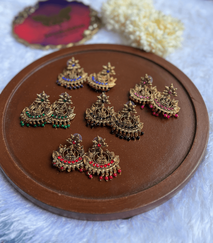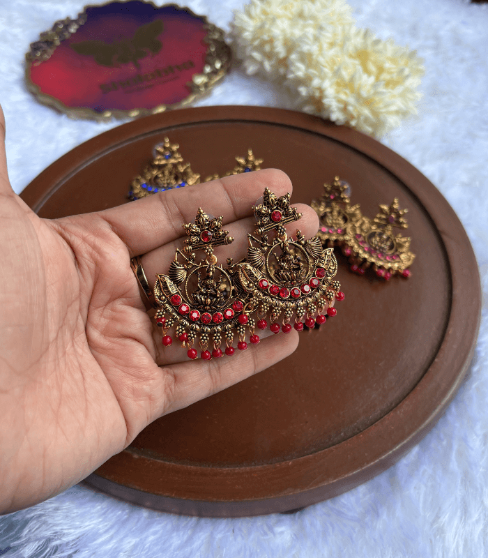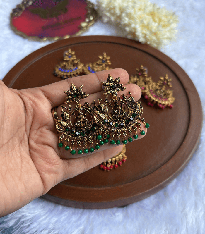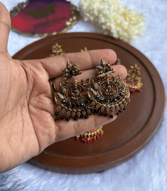 Embrace timeless elegance with our Antique Devi Earrings, crafted with intricate temple-inspired detailing that radiates divine charm. These handcrafted earrings feature a traditional Devi motif, beautifully set in an antique gold finish, making them a statement piece for weddings, festive occasions, and cultural celebrations.
