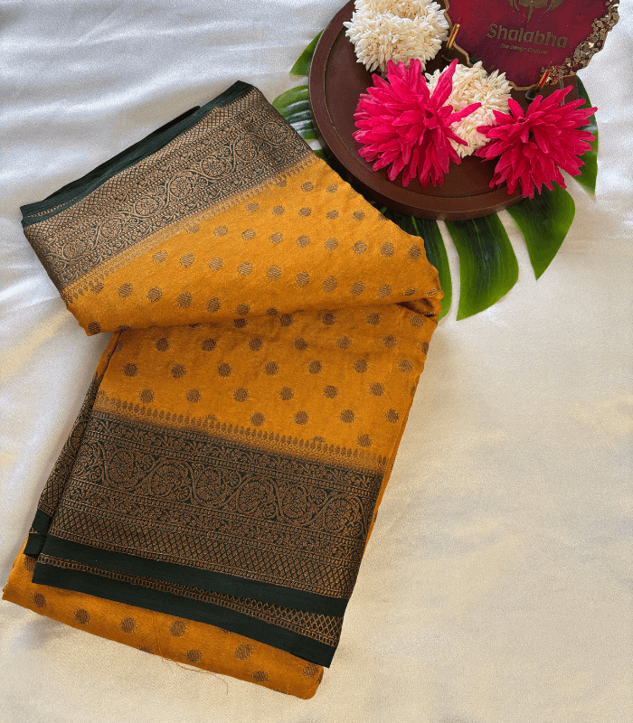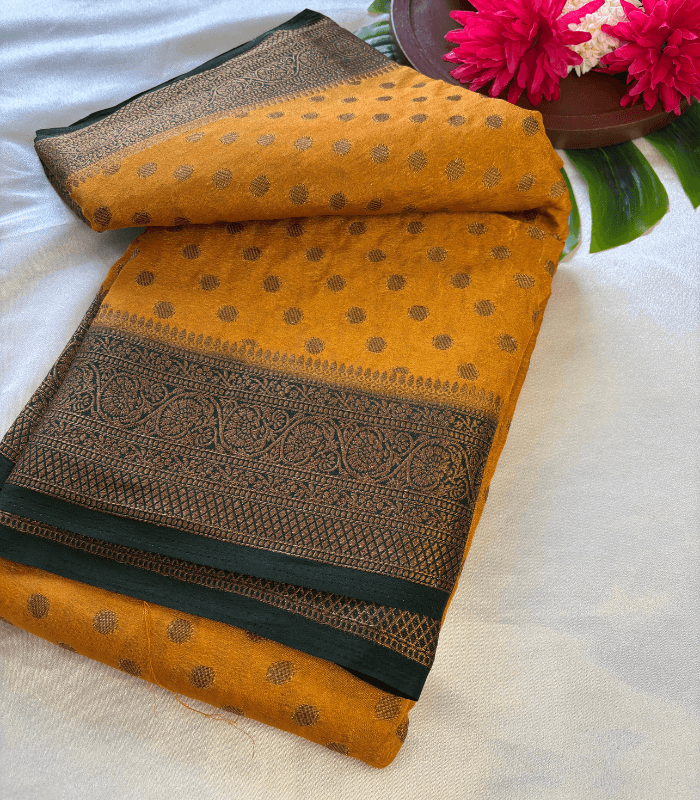 Grace meets tradition in our exquisite Semi Banarasi saree, crafted to bring the richness of Banarasi weaving in a lightweight, comfortable form. Designed with intricate zari-inspired patterns, elegant motifs, and a soft flowing drape, this saree is perfect for festive occasions, family gatherings, and graceful everyday celebrations.