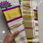 - Design: Pristine off-white base with traditional kasavu golden zari borders