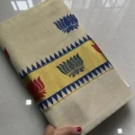 Each saree blends Kerala’s cultural elegance with contemporary artistic flair, making it perfect for festive occasions, cultural gatherings, temple visits, and wedding celebrations. The contrasting lotus patterns in vibrant colors add a striking highlight to the timeless kasavu weave, making these sarees a standout choice in any wardrobe.