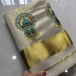 - Design: Embroidered Kathakali face motif on the pallu