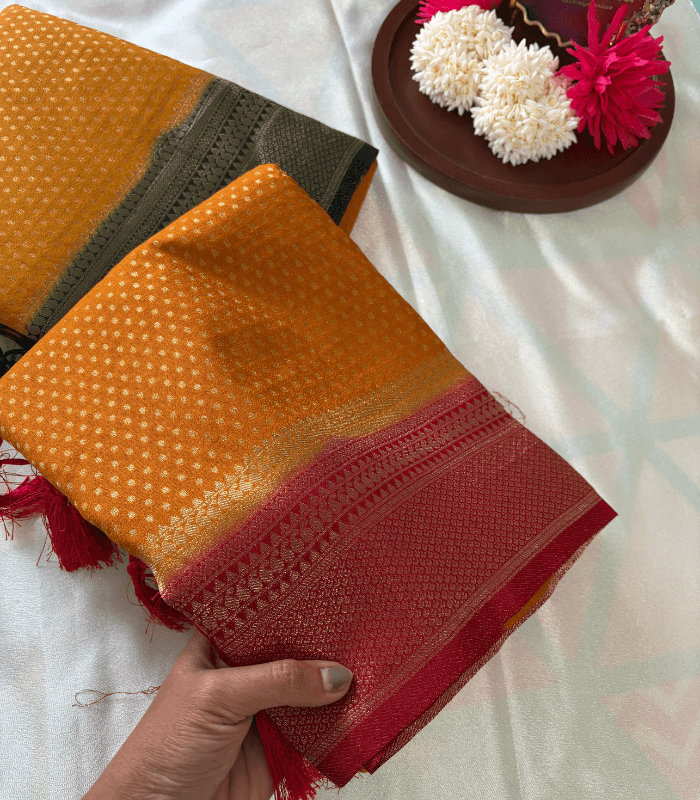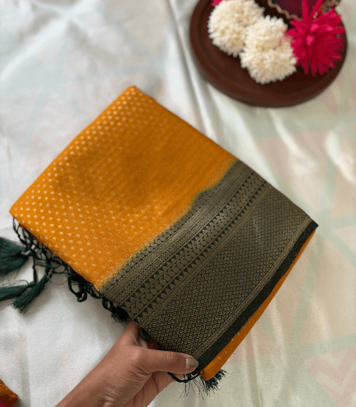 - Fabric: Semi Banarasi sarees – soft, breathable, and lightweight